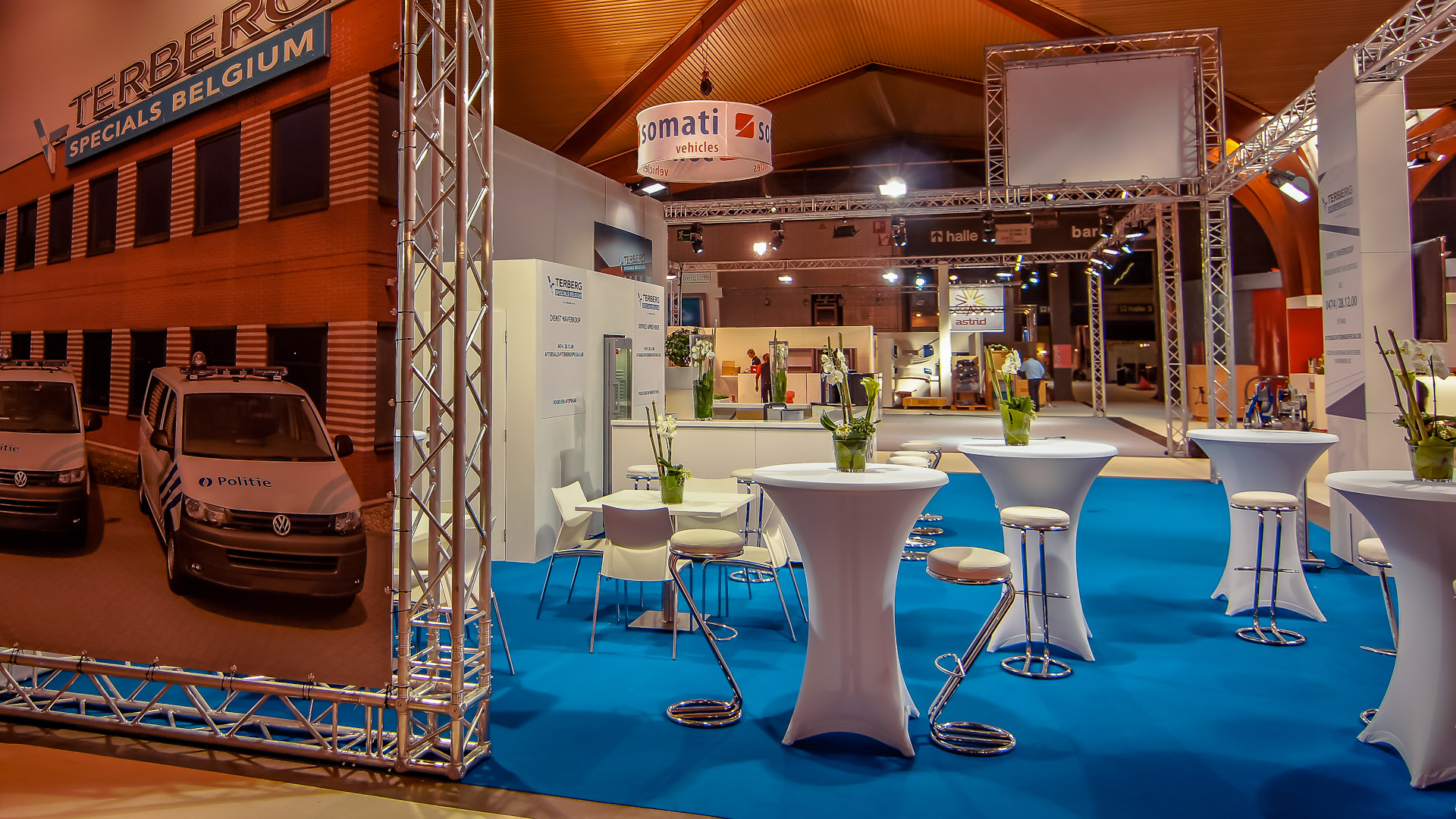 Realisatie van een complete beursstand in 2011 m.b.v. van metalen frames, spandoeken en een ontvangstbuffet voor 1 van onze vaste klanten TERBERG.